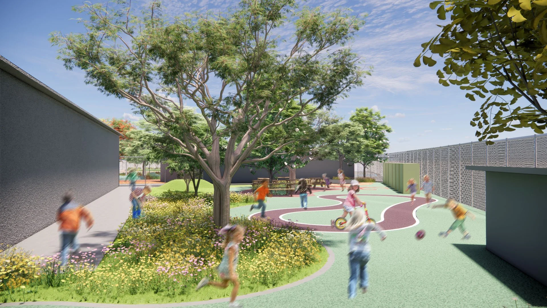 The Mar Vista Elementary School Playground and Campus Exterior Upgrade project transforms an asphalt-dominated campus into a vibrant, educational, and climate-resilient schoolyard. The project supports LAUSD’s Green Schoolyards and PACEUP initiatives by replacing paving with green surfaces, expanding tree canopy, improving outdoor learning environments, and creating inclusive, accessible play areas.